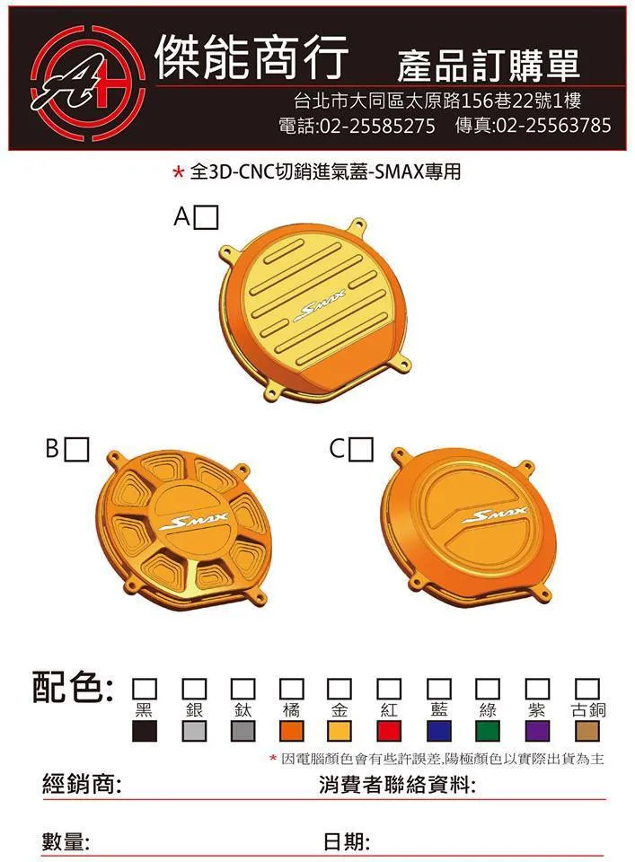 傳動進氣蓋車種:SMAX/FORCE商品單位為:單塊款式A 款式B 款式C 委製商:傑能商行地址:新北市三重區仁愛街421號1樓服務電話:02-2558-5275原產地:臺灣 主要成分:鋁合金製造年月:2023年3月