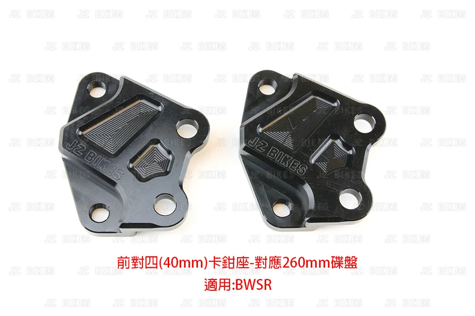 4/5代勁戰/BWSR 鋁合金前對四卡鉗座規格:鎖點40MM (對應加大260MM碟盤)商品單位為:1塊委製商:傑能商行 地址:新北市三重區仁愛街421號1樓服務電話:02-2558-5275原產地:臺灣 主要成分:鋁合金製造年月:2022年3月