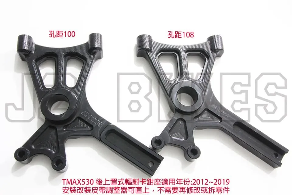 TMAX530/560 鋁合金後上移輻射卡座規格:鎖點100MM (對應原廠282MM碟盤)商品單位為:1塊 委製商:傑能商行地址:台北市大同區太原路156巷22號1樓服務電話:02-2558-5275原產地:臺灣 主要成分:鋁合金製造年月:2023年3月