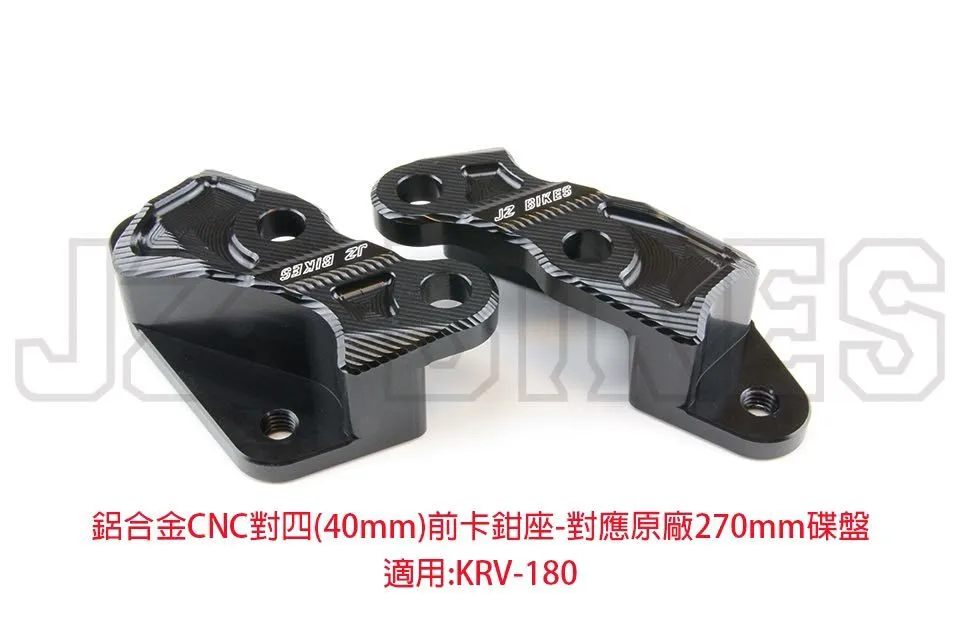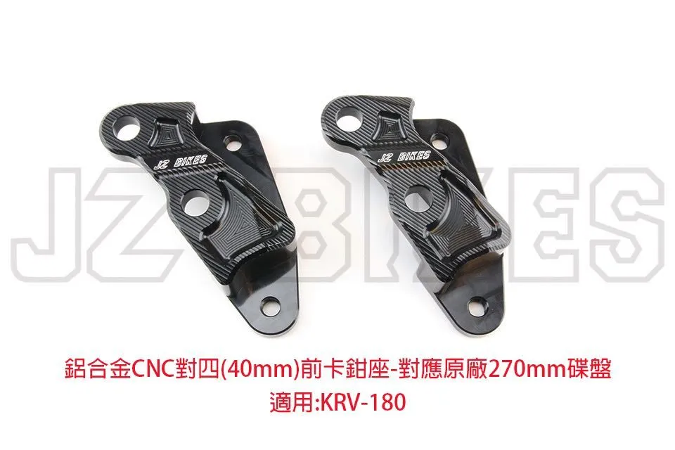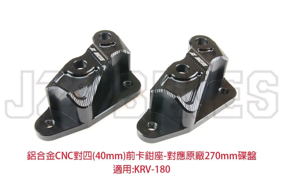 KRV180 鋁合金前對四卡鉗座規格:鎖點40MM (對應原廠270MM碟盤)商品單位為:1塊 委製商:傑能商行地址:新北市三重區仁愛街421號1樓服務電話:02-2558-5275原產地:臺灣 主要成分:鋁合金製造年月:2023年3月