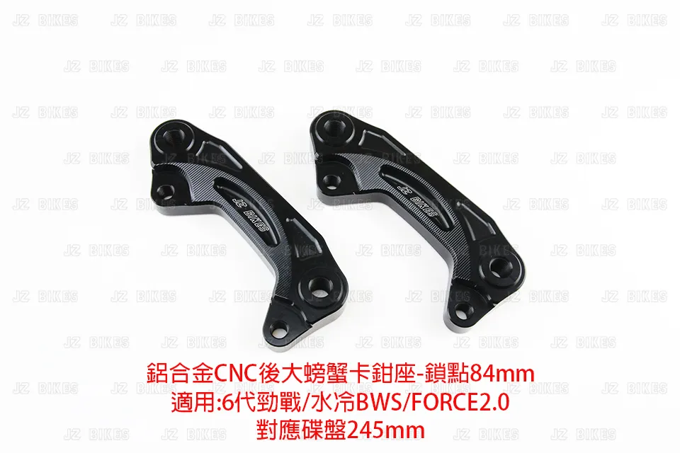 6代勁戰/水冷BWS/FORCE2.0 鋁合金後大螃蟹卡座規格:鎖點84MM (對應加大碟245MM)商品單位為:1塊 委製商:傑能商行地址:台北市大同區太原路156巷22號1樓服務電話:02-2558-5275原產地:臺灣 主要成分:鋁合金製造年月:2023年3月