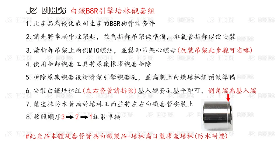 白鐵B8R引擎培林襯套組 適用:6代/6.5代/7代勁戰/水冷BWS/FORCE2.0/NMAX 商品單位:1組兩顆 委製商:傑能商行地址:新北市三重區仁愛街421號1樓服務電話:02-2558-5275原產地:臺灣 主要成分:白鐵製造年月:2025年11月