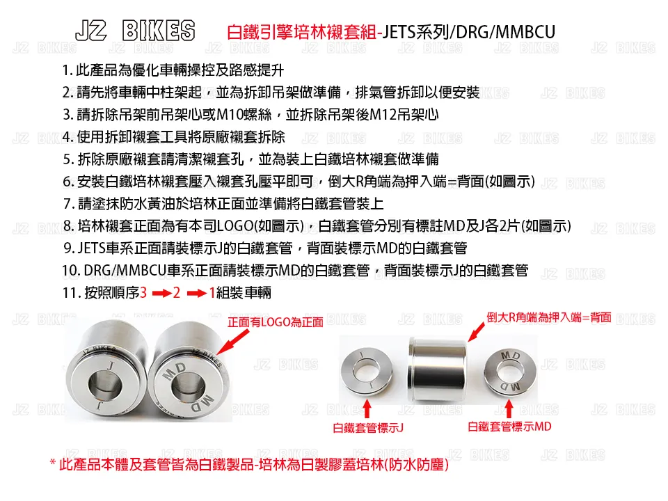 白鐵引擎培林襯套組適用:JETS/JETSR/JETSL/DRG/MMBCU優化避震做動,讓騎程操控感更加提升商品單位:1組兩顆#培林如果日後損壞也不會傷到引擎本體 委製商:傑能商行地址:新北市三重區仁愛街421號1樓服務電話:02-2558-5275原產地:臺灣 主要成分:白鐵製造年月:2025年10月