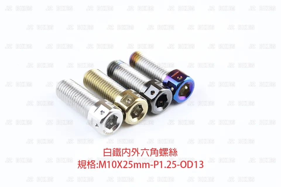 白鐵內外六角螺絲 規格:M10X25mm-P1.25-OD13商品單位為:單顆 委製商:傑能商行地址:新北市三重區仁愛街421號1樓服務電話:02-2558-5275原產地:臺灣 主要成分:白鐵製造年月:2024年6月