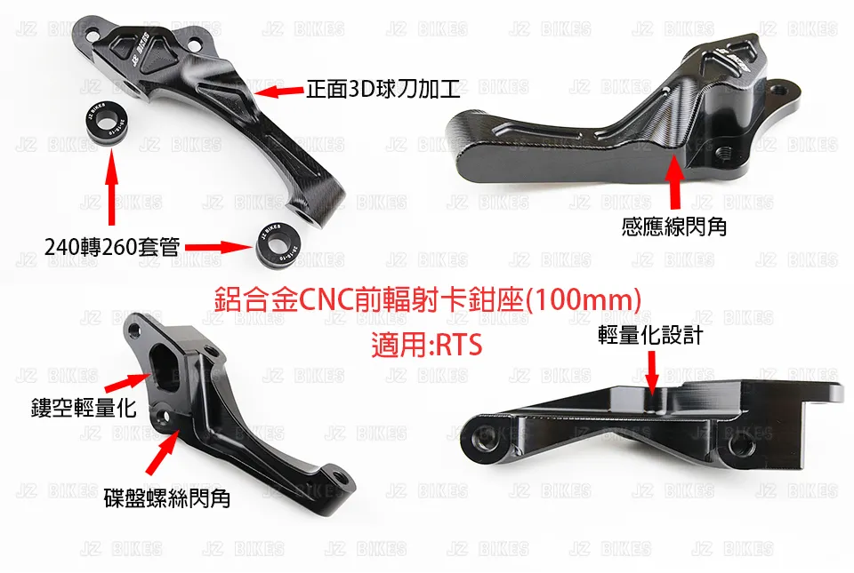 鋁合金CNC前輻射(100mm)卡鉗座對應:240mm/260mm碟盤碟盤 (出貨皆附鋁合金6061-T6套管10mm*2) 適用:RTS 商品單位為:單塊 商品現貨為:黑色 #正面3D球刀CNC加工 #鏤空設計除了輕量更加美觀 #藏線溝槽讓線不再亂甩更加俐落有型 #背面閃角設計解決改裝碟盤碟盤螺絲太凸會磨到的問題 委製商:傑能商行地址:台北市大同區太原路156巷22號1樓服務電話:02-2558-5275原產地:臺灣 主要成分:鋁合金製造年月:2024年9月